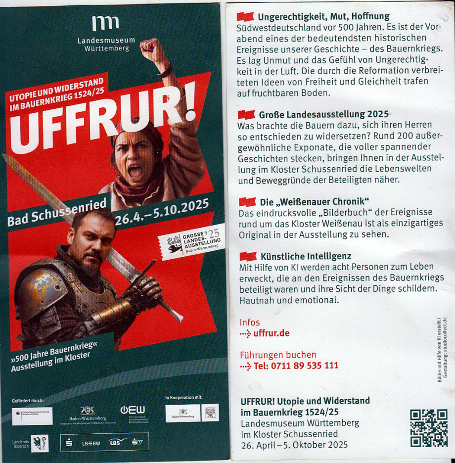 Die Tagesfahrt beginnt daher in Memmingen in der Ausstellung „Projekt Freyheit - Memmingen 1525“. Fortgesetzt wird die Fahrt in Bad Schussenried. Im dortigen Kloster findet die baden-württembergische „Große Landesausstellung“ mit dem Titel „Uffruhr! - Utopie und Widerstand im Bauernkrieg 1525“ statt. Zu beiden Ausstellungen werden Führungen angeboten.