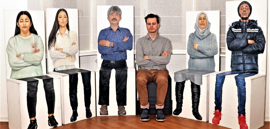 40 Menschen unterschiedlicher Herkunft hat der 1984 geborene Künstler porträtiert. Alle tragen sie die Arme vor der Brust verschränkt und die Augen geschlossen. Damit verweist Pelz auf einen inneren Raum, der Erinnerungen, Sehnsüchte und Hoffnungen. Die einzelnen Ölbilder sind zu lebensgroßen dreidimensionalen Objekten zusammengefügt. So entsteht mit Mitteln der Malerei eine umfassende Ansicht der portraitierten Personen. Wer immer die Bilder betrachtet wird von ihnen hineingezogen in die innere und äußere Beschäftigung mit Menschen und ihren Schicksalen.