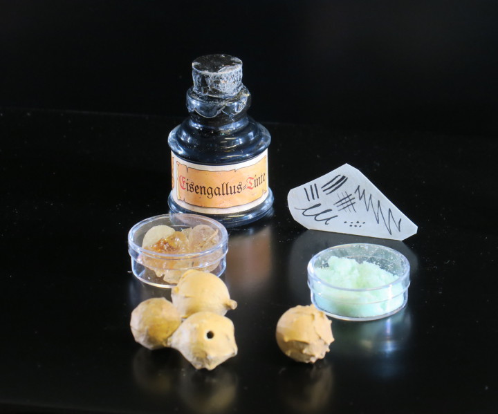 Eisengallustinte wird aus Galläpfeln, Eisensulfat und Gummiarabicum hergestellt – ist aber auf Papier verwendet aggressiv und verursacht „Lochfras“.