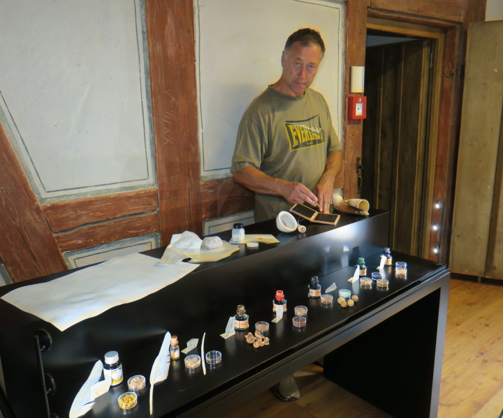 Werner Maier vom „Freundeskreis Kloster Lorch“ erläutert die Funktion einer Wachstafel für Schreibübungen.